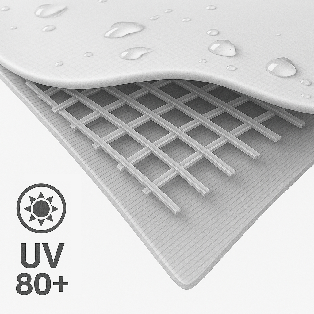 A szerkezetet megerősített tető és alsó acél váz tartja, amely rendkívül ellenálló a széllel, esővel és más időjárási hatásokkal szemben.